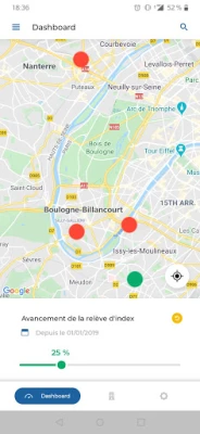 • Visualisez l'avancement de la relève des compteurs sur votre périmètre et identifiez les sites les plus proches de vous restant à relever