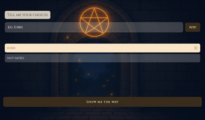 Fate is your mystical decision-making companion that transforms your choices into real-world signs. Simply enter a few options, and Fate will use your surroundings and a dash of AI magic to map each choice to something you might encounter nearby — a storefront, an object, a scene.