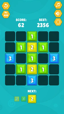 Merge numbers by adding tiles with the same number to the field next to already placed tiles (vertically or horizontally).