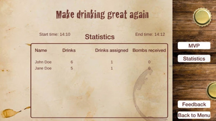 We are Germans, we like statistics, so here you go: During the game, you will see who had how many drinks and at the end of the game, we even give you a pretty statistic about it.