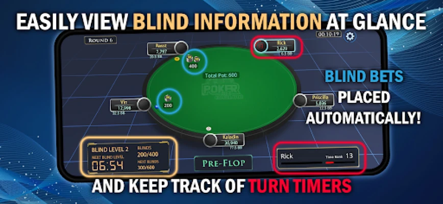 - Customize and keep track of blind levels, blind values, and blind timers.