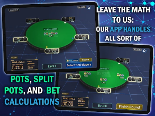 - The app calculates all sorts of bets, pots, split pots, side pots, and blinds for you.