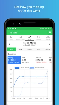 The History page will show you the total tips and wages you earned for the any week, 2 weeks, semimonthly, month and year.