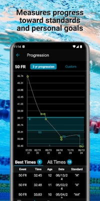 - Track each swimmer's journey towards their next milestone by visualizing personal bests against National Age Group (NAG) motivational standards, state/LSC standards, and meet qualifying standards like Speedo Sectionals and Junior Nationals. The app includes all USA Swimming's state/LSC time standards.