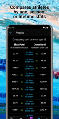 - Want to see how you stack up against friends, rivals, or swimming legends? Now you can! Compare lifetime bests, season bests, or best times at the same age. Review a swimmer's progress over the past year and analyze seasonal trends to set realistic expectations for race day.